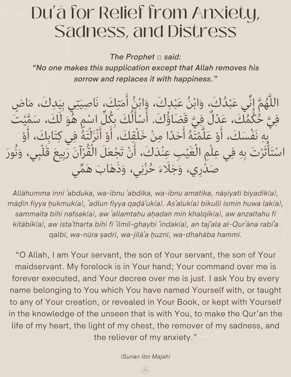 The Prophet ﷺ said: “There is no one who is afflicted by distress and sorrow and says this du‘ā except that Allah will remove his distress and replace it with joy.” The companions asked, “O Messenger of Allah, should we learn these words?” He ﷺ said, “Yes, whoever hears them should learn them.” (Ahmad)