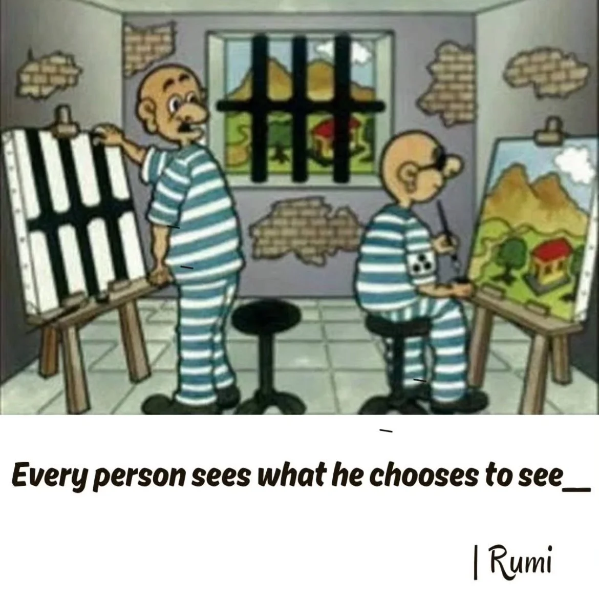 The other sees the beauty that lies beyond the bars, the mountains, the trees, the colours of life. His painting is filled with hope and possibility.